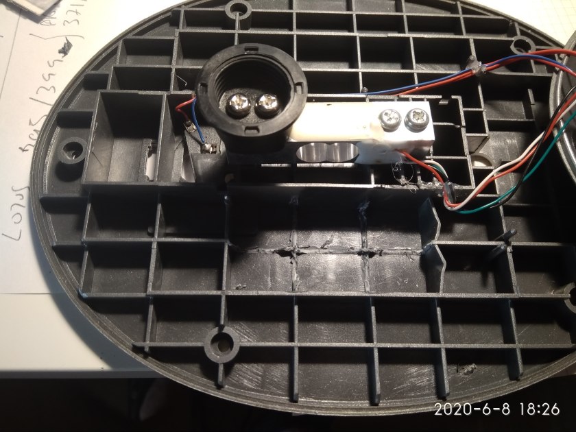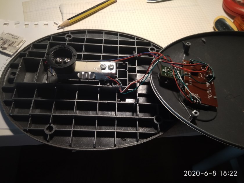 Asimismo es visible  junto a la placa del display lcd  ,la mini-placa del pulsador de doble funcionalidad de encendido y tara.