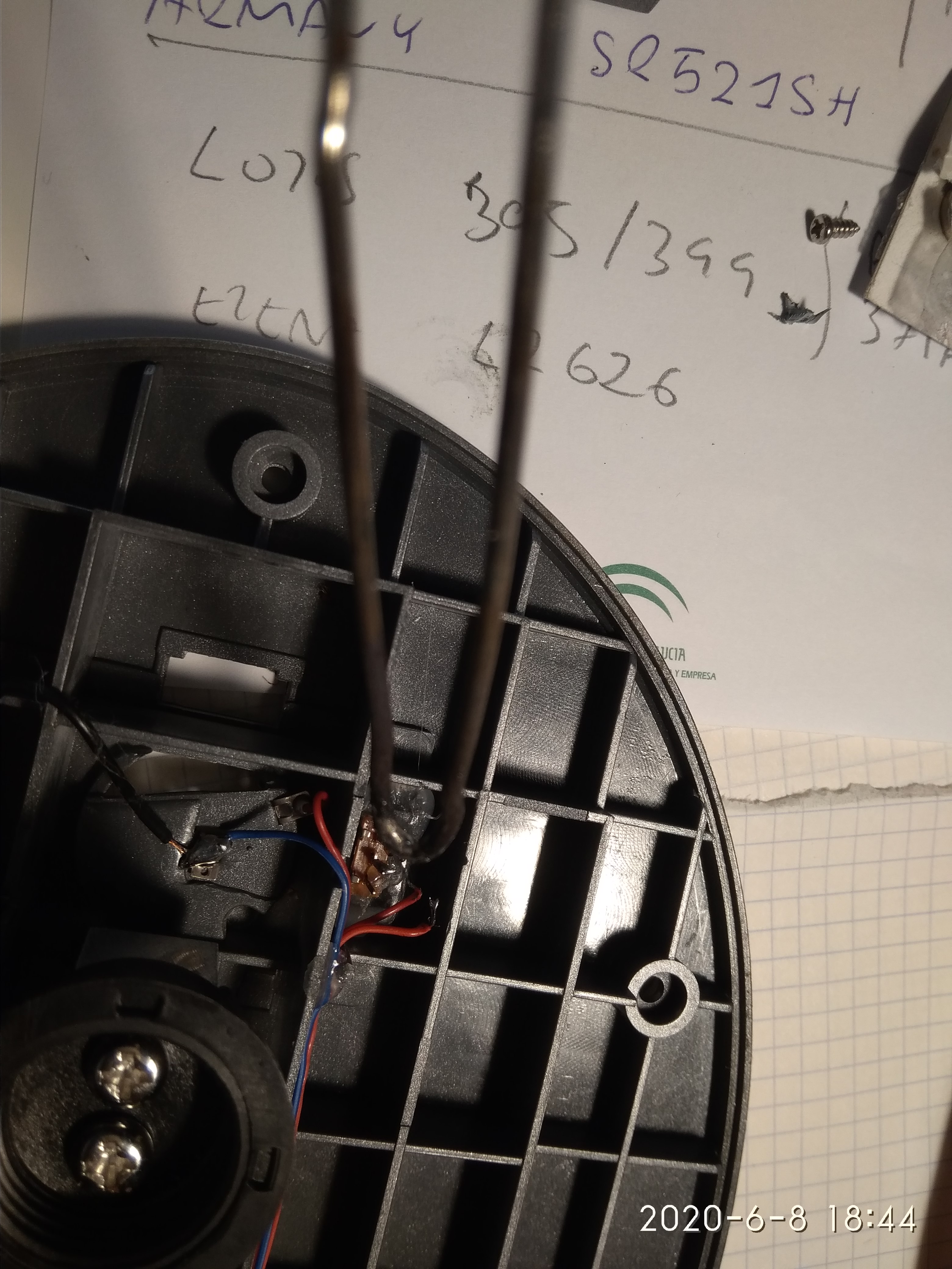 Soldaremos pues el  hilo negativo del porta-pilas al terminal central del porta-pilas de botón ( si no esta seguro use un polímetro para comprobarlo).