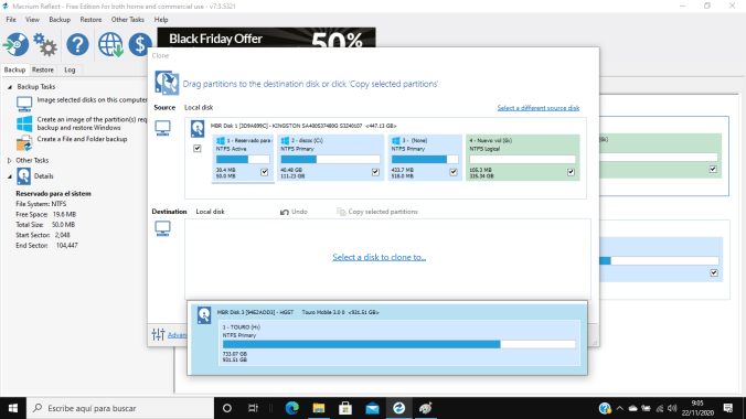 En este paso, es fácil que una vez conectado el disco nuevo al pc , en caso de ser un disco nuevo no nos reconozca windows la partición, para lo cual por si el sw de clonación no lo permite es interesante creala ( aunque luego eliminará esta creando normalmente en windows )