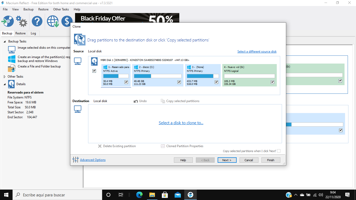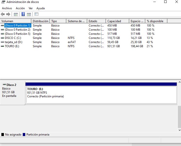 En este paso, es fácil que una vez conectado el disco nuevo al pc , en caso de ser un disco nuevo no nos reconozca windows la partición, para lo cual por si el sw de clonación no lo permite es interesante creala ( aunque luego eliminará esta creando normalmente en windows )