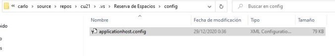 Este archivo se llama «applicationhost.config» y en proyectos de Visual Studio se encuentra en una carpeta llamada «.vs\nombre de proyecto\config» que encontramos en el directorio de la solución, en la subcarpeta del nombre del proyecto y dentro de ella, en la subcarpeta «config».