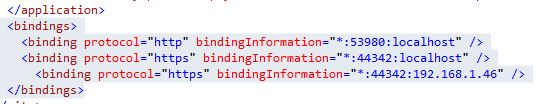 <binding protocol=»https» bindingInformation=»*:44342:localhost» />
