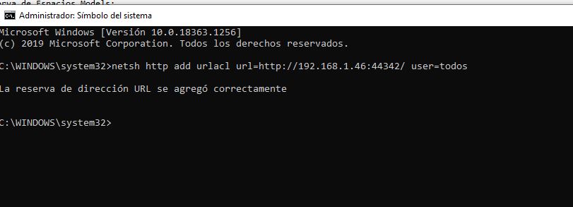 Como hemos comentado antes, este paso no será necesario si estamos ejecutando Visual Studio (y por tanto IIS Express) como administrador. Pero si no es así, debemos abrir una la línea de comandos con permisos elevados y utilizar la siguiente instrucción para reservar la URL y darle derechos de uso a determinados usuarios del equipo, por ejemplo como sigue desde la terminal de windows (cmd) con permisos de administrador (no lo intente desde PowerShell porque le dara error) :
