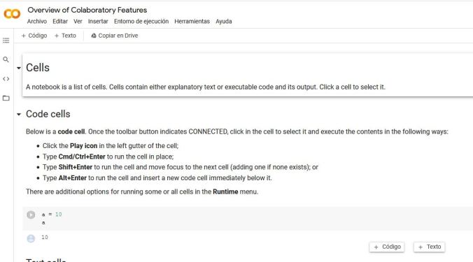 Los cuadernos de Colab permiten combinar código ejecutable y texto enriquecido en un mismo documento, además de imágenes, HTML, LaTeX y mucho más. Los cuadernos que creas en Colab se almacenan en su cuenta de Google Drive de modo qu e puedes compartir sus cuadernos de Colab fácilmente con compañeros de trabajo o amigos, lo que les permite comentarlos o incluso editarlos (consulte más información en Información general sobre Colab).