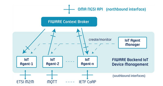Para lograr esta conectividad de elementos y a su vez permitir la adición de otras funcionalidades, el elemento principal de la nube de FIWARE es el llamado ORION Context Broker, un intermediario que permite la conectividad a todo tipo de elementos, bien mediante su API NGSI que emplea REST, o bien mediante agentes. Estos agentes no son más que módulos intermediarios que pueden traducir otros formatos o protocolos de comunicación a NGSI, de manera que se posibilita de esta forma la conectividad con otros dispositivos que no puedan establecer comunicaciones mediante REST.