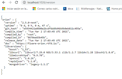 - Después de unos segundos, debería tener su Context Broker ejecutándose y escuchando en el puerto 1026 lo cual podemos comprobar si nos vamos a la url: http// localhost: 1026/version