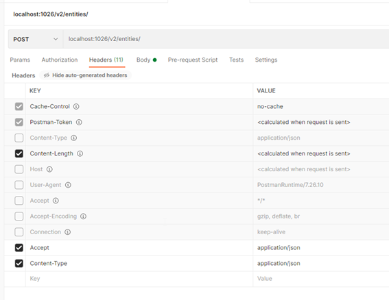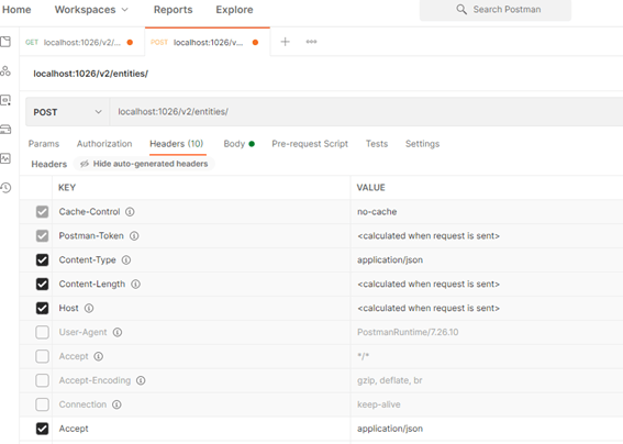 Debemos extremar las cabeceras (headers) cuando enviamos datos a Orión Content Bróker, pues el Key Host que viene por defecto en Postman no nos sirve, para lo cual deberemos crear otra key asociándola a “application/json”. Asimismo, de igual manera lo haremos con el atributo “Content-Type”.