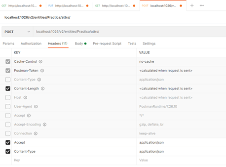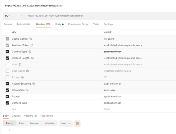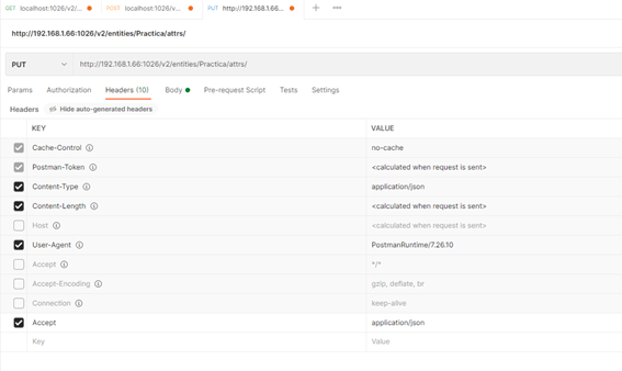 -Desde Postman configuramos la url a http://192.168.1.66:1026/v2/entities/Practica/attrs/ , usaremos el método PUT y añadiremos a headers las keys Accept y Content-type al valor application/json