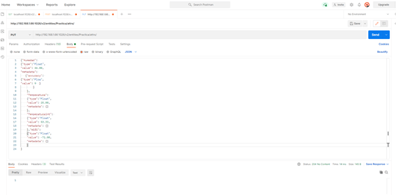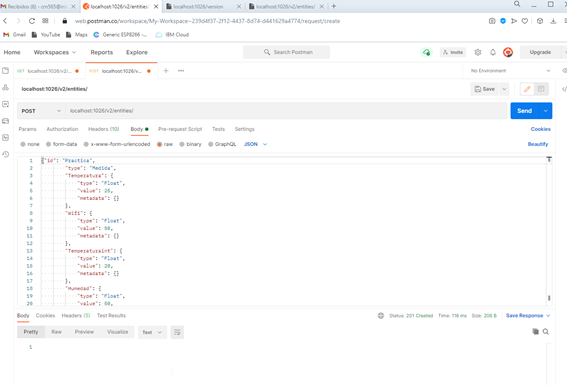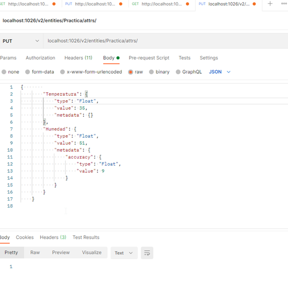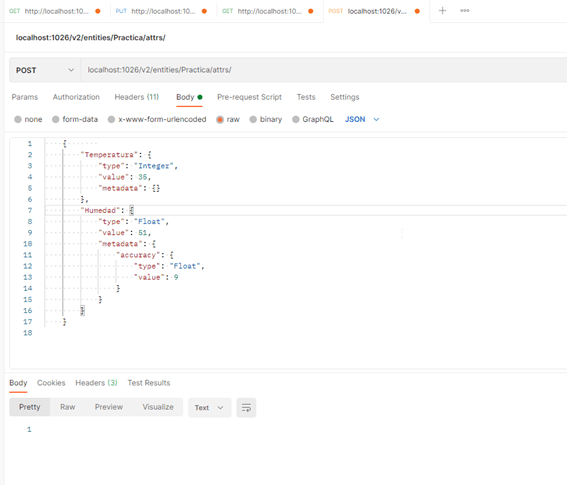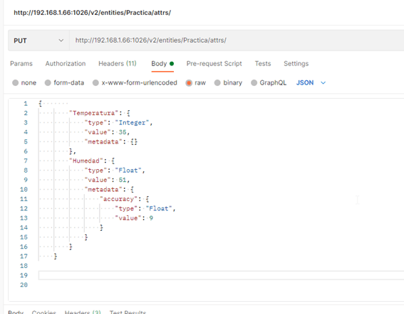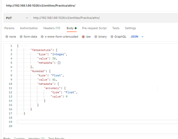 Si queremos cambiar un valor se hará a través de la url http:// localhost:1026/v2/entities/Practica/attrs/ y cambiaremos el cuerpo y la cabecera