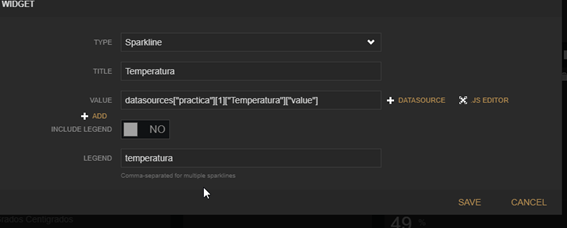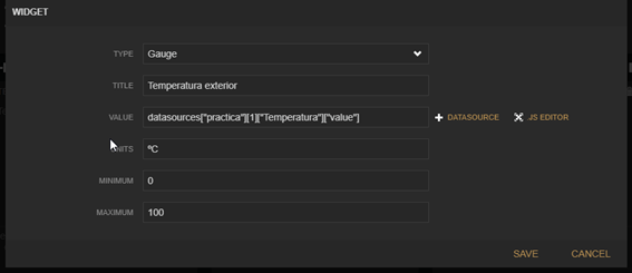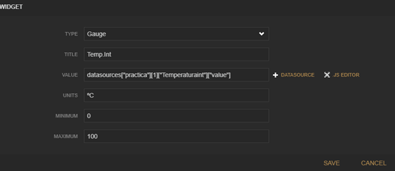 - Temperatura interior:Lo ideal, igual que con la temperatura exterior es usar un controlador tipo gauge definiendo el origen de datos, los valores mínimos –máximo así la unidad y el descriptivo.