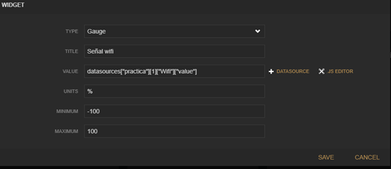 - Señal wifi:Lo ideal, es usar un controlador tipo gauge definiendo el origen de datos, los valores mínimos –máximo así la unidad y el descriptivo.