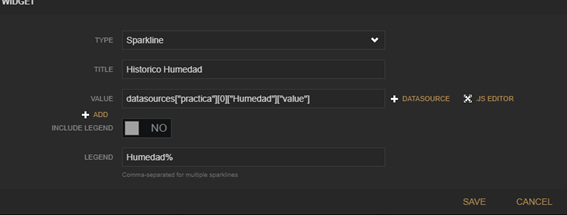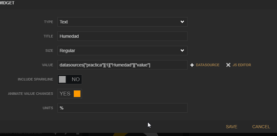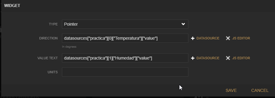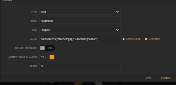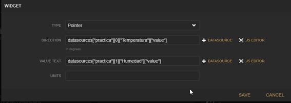- Humedad:Lo ideal, es usar un controlador tipo gauge definiendo el origen de datos, los valores mínimos –máximo así la unidad y el descriptivo.