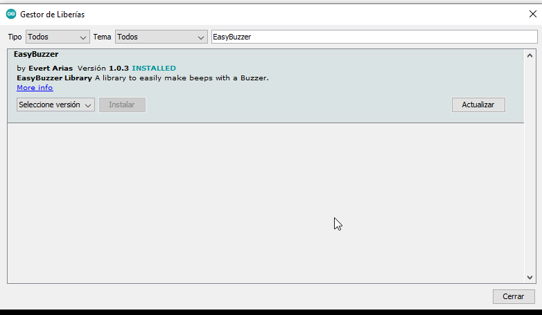 Para empezar a usar esta librería, necesitaremos incluir la biblioteca en el boceto mediante la opción Herramientas->Administrar Bibliotecas->Buscar «EasyBuzzer»
