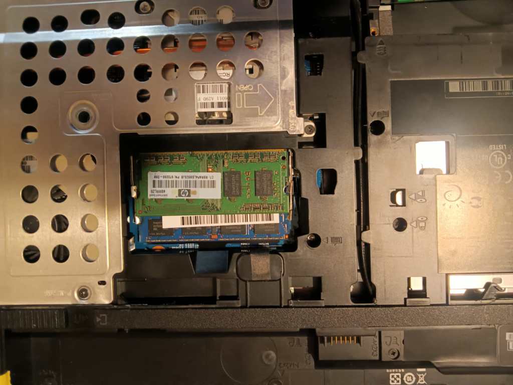 Ambas ranuras de RAM disponibles debajo de la cubierta. Esta computadora portátil puede admitir módulos RAM DDR3-12800 SODIMM de hasta 16 GB (2×8 GB).