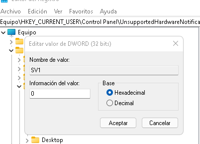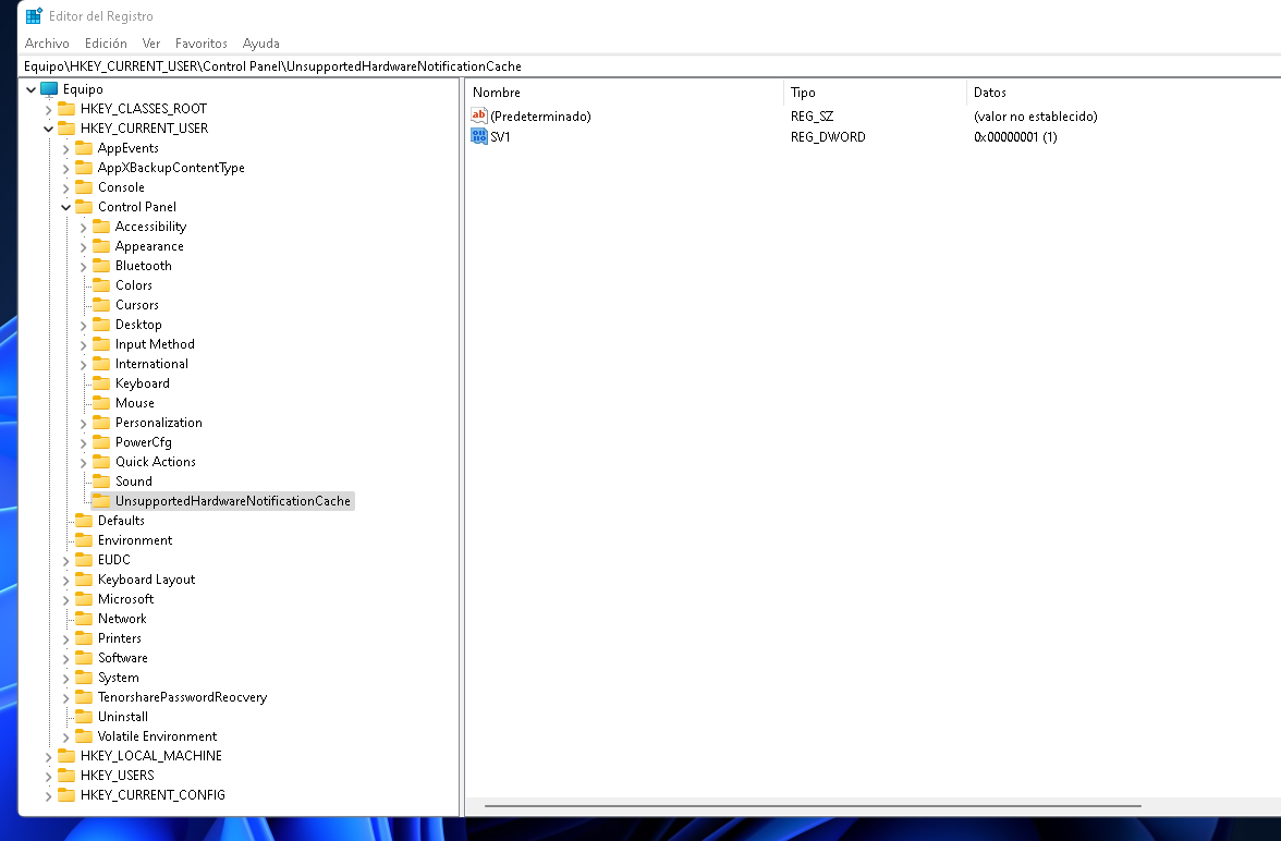 HKEY_CURRENT_USER\Control Panel\UnsupportedHardwareNotificationCache