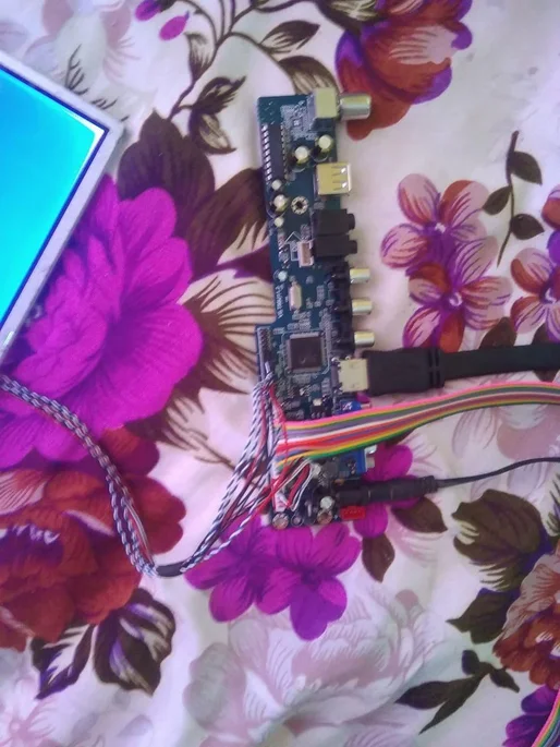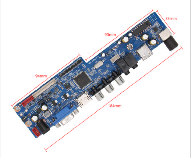 A continuación, necesitamos un controlador LCD universal. Recibe a través de VGA / HDMI / RCA o cualquier otro método de entrada y procesa la señal y luego controla la pantalla. Esta es la parte principal de nuestro trabajo. Usamos e el controlador LCD universal TS56U11.2. Está hecho en China y el PCB tiene mala calidad. Viene con un control remoto, una serie de botones pulsadores y un módulo receptor IR. La consola de botones y el módulo receptor IR están en la misma PCB. Pero podemos partirlo en dos pedazos para hacer un montículo. También obtenemos un cable para conectar la consola de pulsadores y el módulo receptor IR a la placa base.