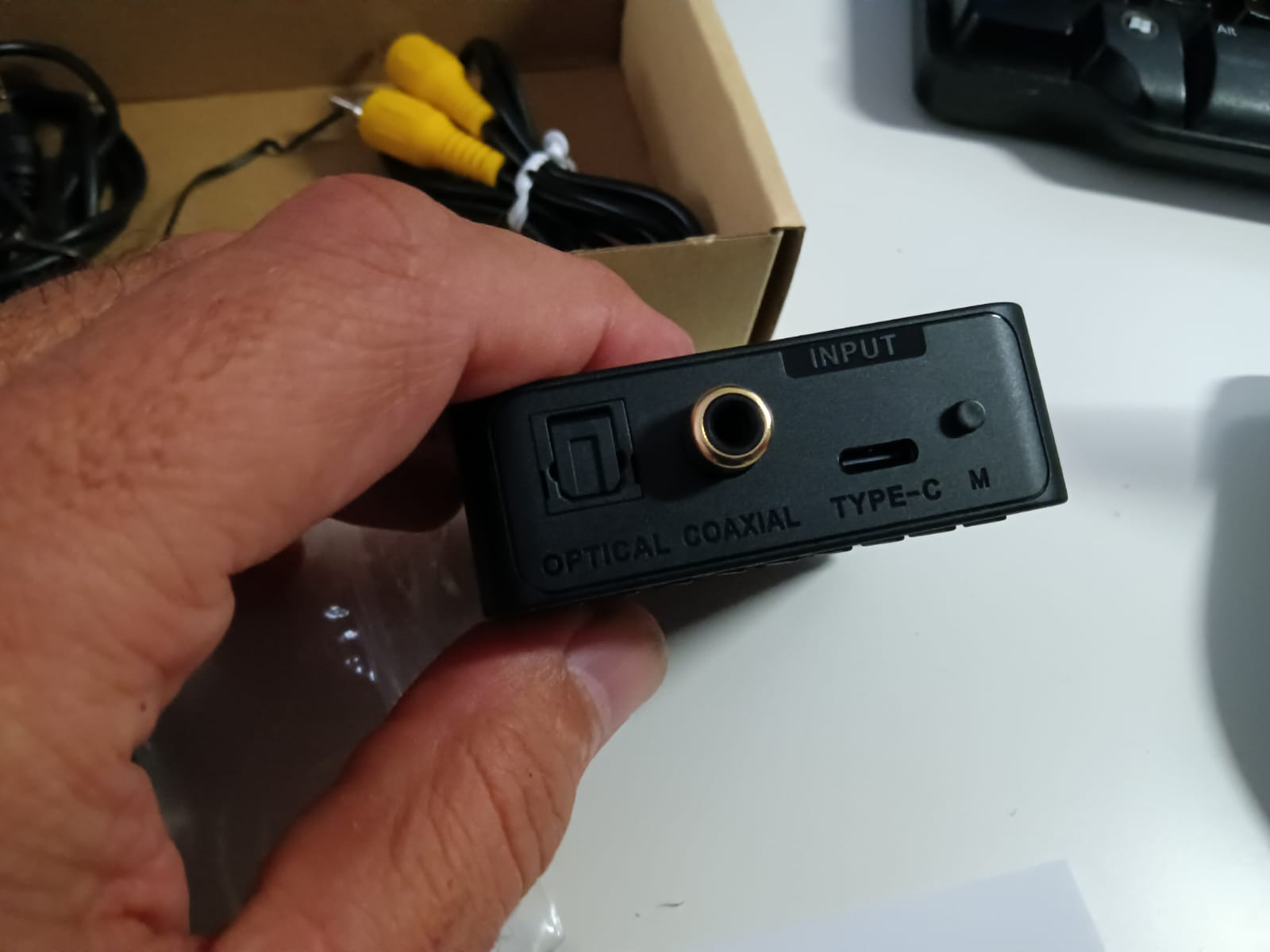 Este es el aspecto de la parte de trasera con el conector de alimentación USB tipo C (incluye el cable) , las entradas òptica y coaxial y el pulsador para cambiar la entrada (por defecto es òptica).