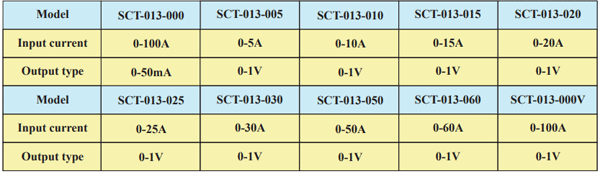 Esta tabla nos describe las principales características de la familia de sensores SCT disponible :