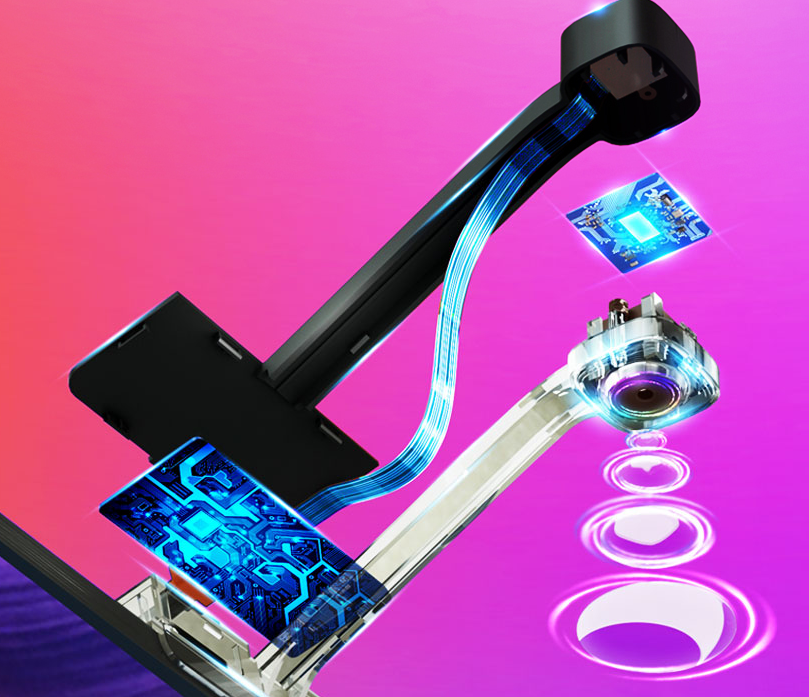 La gran innovación de este fabricante consiste en sustituir el hub con las entradas hdmi, que nos obliga a usar una señal externa sin poder contar con las que incluye un TV inteligente o simplemente el TDT, por una cámara inteligente que se coloca en la parte superior del TV al estilo de una web cam externa y que cuenta además una innovadora división de zonas.