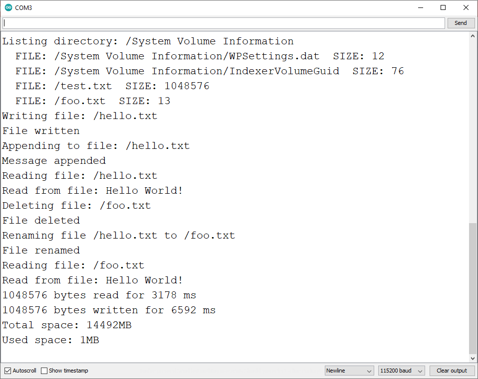 Serial.printf("%u bytes written for %u ms\n", 2048 * 512, end);