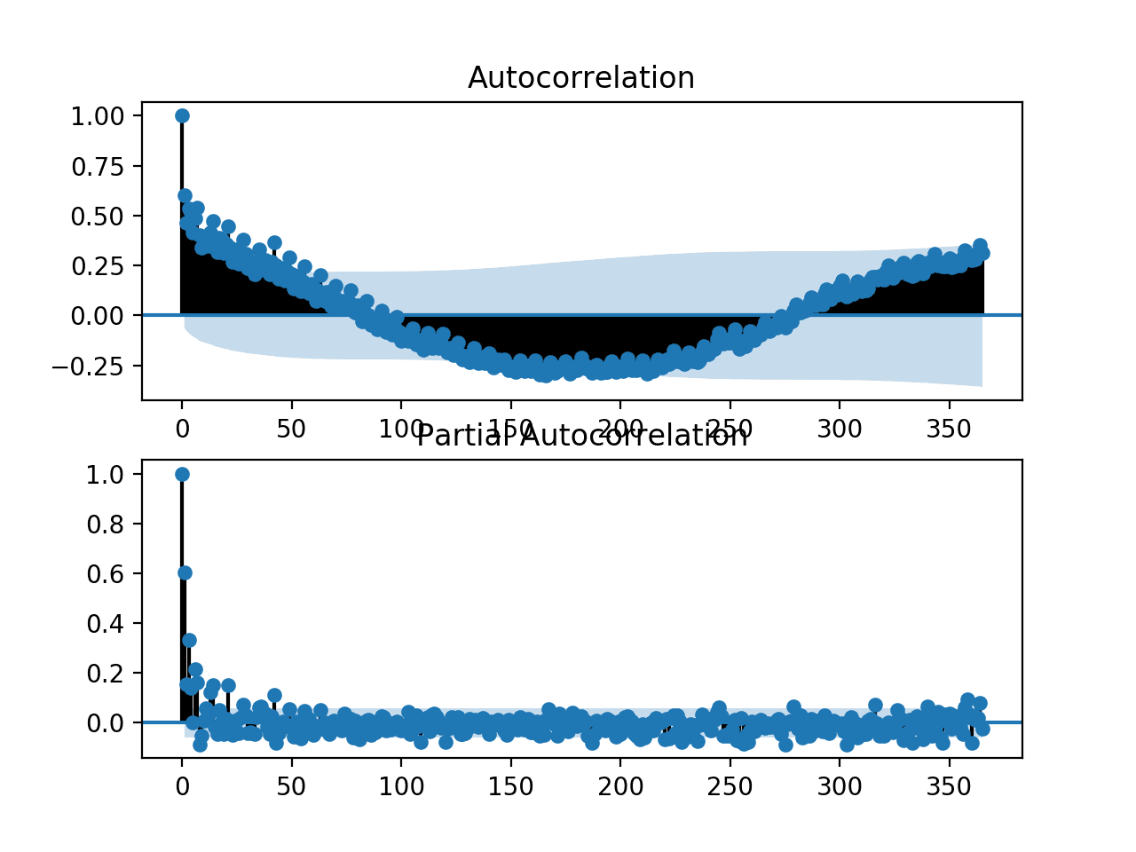 Entonces podemos crear una sola figura que contenga un gráfico ACF y PACF. Se puede especificar el número de pasos de tiempo de retraso. Arreglaremos esto para que sea un año de observaciones diarias, o 365 días.