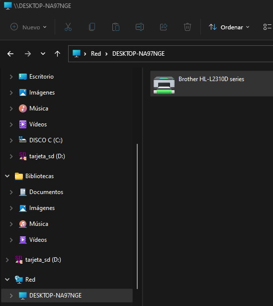 Asegúrese de que esta en el equipo del cliente y acceda al Explorador de archivos. Pulse en el apartado de red y al pinchar sobre el equipo anfitrión debería detectar de forma automática la impresora compartida.