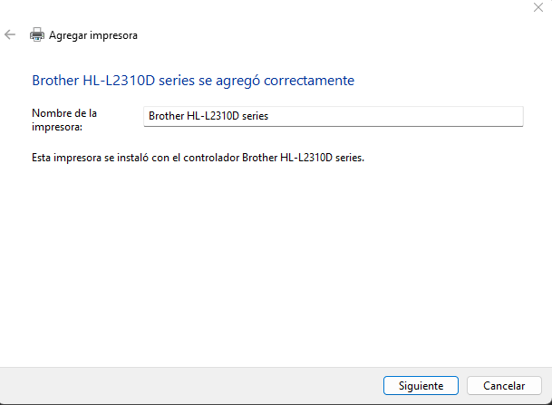 Pulsamos en siguiente, y si hay varias impresoras podemos pulsar el check de «establecer como predeterminada» para que Windows mande a imprimir por defecto a esta.