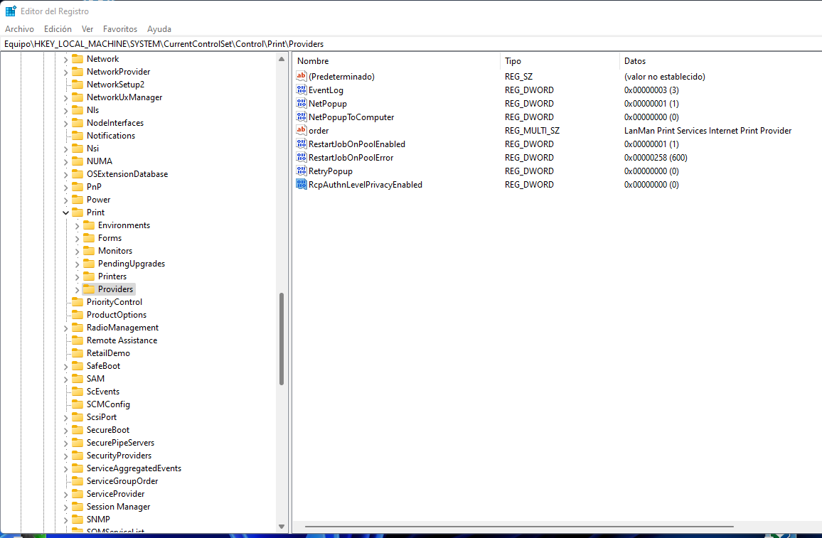 La nueva clave deber del tipo DWORD (32 bits) en Equipo\HKEY_LOCAL_MACHINE\SYSTEM\CurrentControlSet\Control\Print\Printers