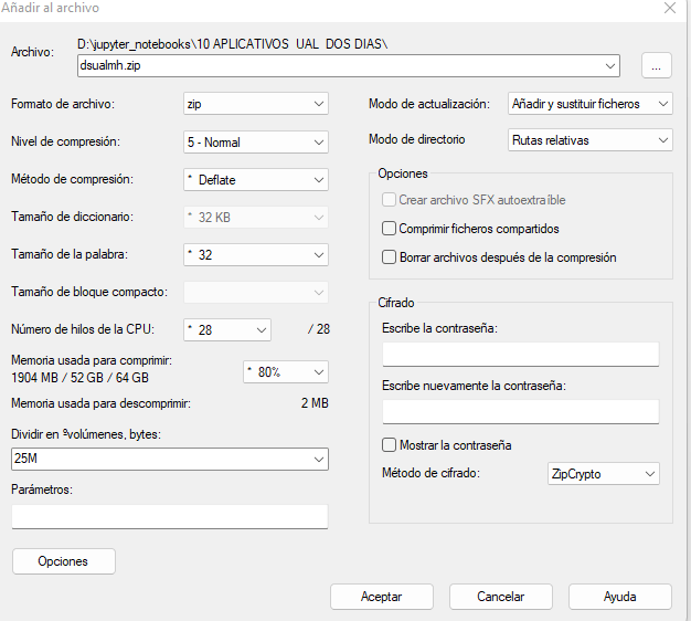 En la parte inferior de la ventana tiene otra configuración que cambiar. En Split to volumes, bytes debes elegir el tamaño máximo de las partes en las que se cortará. Por ejemplo, si quiere que se corte en partes de 10 MB, elija 10M,para partes de 100 MB, 100M, y si el fichero es para subirlo a github debe seleccionar 25M ( observe que la letra M es importante porque indica Mb)