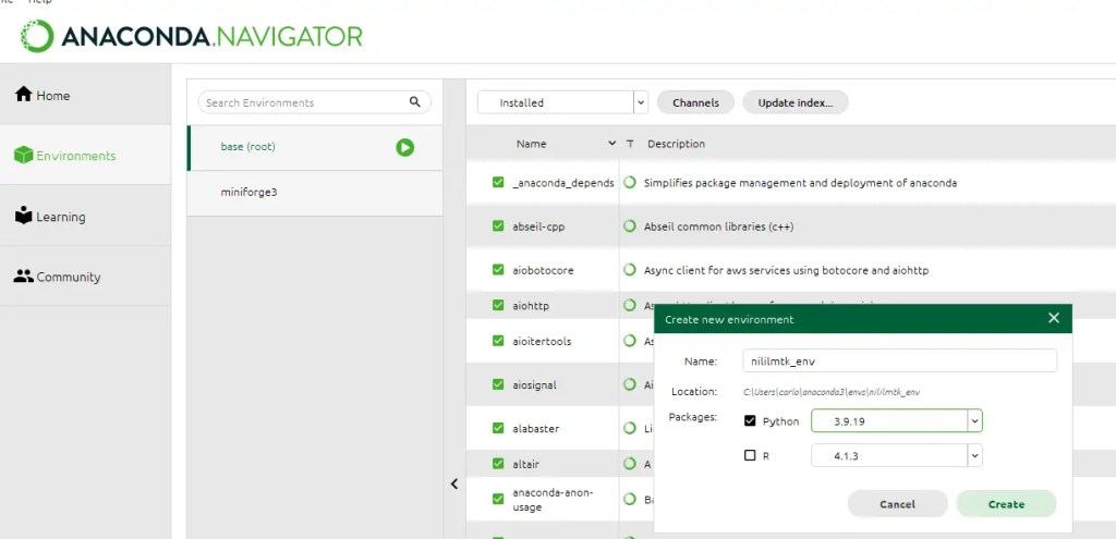 Para ello lo podemos eliminar desde anaconda navigator opción Remove o bien desde consola (conda deactivate y conda env remove -n nilmtk-env), y crearemos uno nuevo desde anaconda navigator, con python 3.8