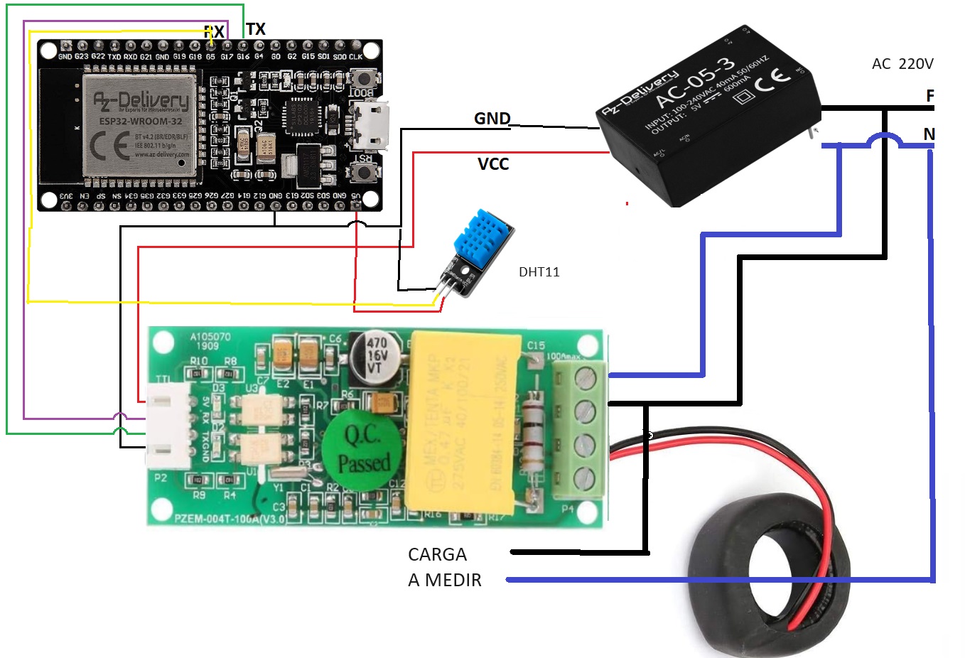 ATENCION: La Fase y el Neutro se conectarán a la corriente directa de la casa. Dentro del anillo toroidal para la medición de la corriente ( que puede ser en forma de pinza o no ), deberemos pasar el cable de la Fase (color Negro) sobre el cual deseamos llevar a cabo las mediciones, que puede ser el mismo que utilizamos para suministrar corriente al circuito o no.