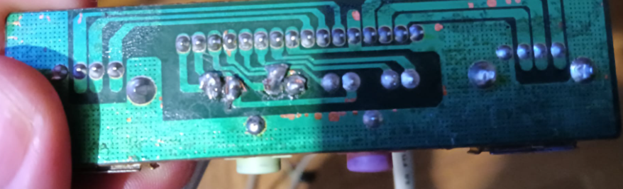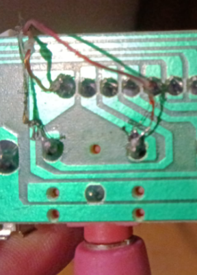 Ahora ,si vemos las conexiones de la placa anterior mas abajo, vemos a la izquierda ( arriba del conector verde) dos puntos gruesos de soldadura para cada canal, que son precisamente una entrada sense mas la señal de audio para cada canal de audio. Además para el micrófono ocurre justo los mismo: es decir se usan 4 hilos por jack mas la masa común.