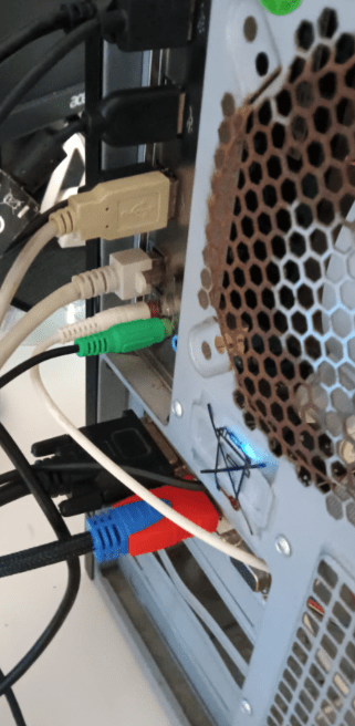 Y como vemos, en la imagen de abajo el otro extremo del cable terminado en un jack blanco que hemos soldado en la placa lo conectaremos al conector trasero rosa correspondiente a la entrada de micrófono.