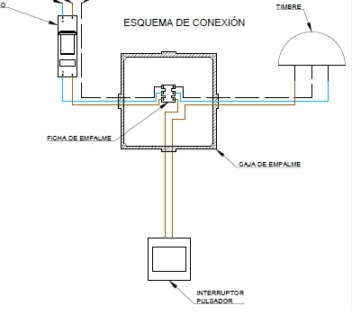 En la siguiente imagen vemos una instalación convencional de un timbre clásico que funciona a 220v . Como vemos no hay nada «mágico» solo hay una fase y neutro que van a una caja de conexión y uno de los hilos se deriva al pulsador y el otro va directamente al timbre ( y claro, el otro hilo del pulsador va hacia el timbre).
