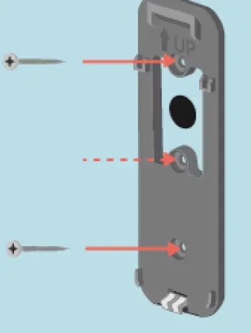 - Fije la placa posterior a su superficie con los tornillos que se incluyen. En una superficie lisa, utilice los orificios superior e inferior. En una superficie irregular, utilice los agujeros superiores y medios. Ojo tenga cuidado porque se debe colocar con la marca UP hacia arriba.