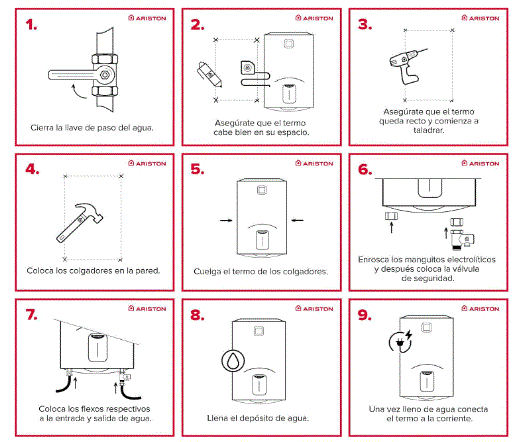 Realmente como vemos en la siguiente imagen (cortesía de Aristón) no es demasiado difícil pues se resume en fijar este a la pared ,enroscar los manguitos a las bocas de entrada y salida, enroscar la válvula de seguridad y finalmente conectar los manguitos de entrada y salida de agua.