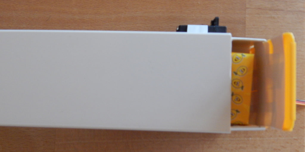El dispensador de caramelos se puede realizar con un canal de cables 60×40 mm y el servobrazo extendido con tubo retráctil unido al baston del servo.