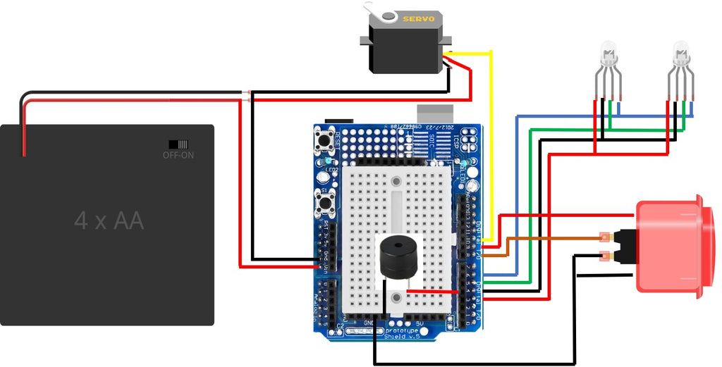 Todo el conjunto cabe en una caja de cartón que podemos cerrar para que no se vea el mecanismo. En la imagen , a la derecha vemos el aspecto del Arduino Uno con Escudo de Prototipos ( para el buzzer ). En la parte de la derecha vemos los 2 LED RGB y el botón iluminado (igual que los usados en consolas de juegos)