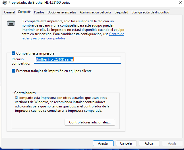 - Repita todo el proceso anterior pero activando el check de compartir la impresora