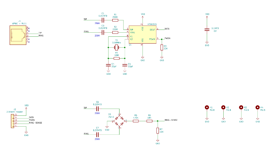 Vemos en el circuito como la señal de la línea telefònica en lugar de usar un transformador usa dos condensadores de 0.2microFaradios cuyos extremos van acoplados a un puente de diodos y su salida mediante un divisor de tensión es la que usaremos en el microcontrolador como RING-SENSE. Además de la línea telefónica también directamente van sendas resistencias de 200k y condensadores de 0.01microFaradios hacia los pines TIP y RING del. Respecto a la parte superior derecha, es solo opcional y es la parte de alimentación de 5V DC pues HT1050 es simplemente un regulador de 5v del propio fabricante.
