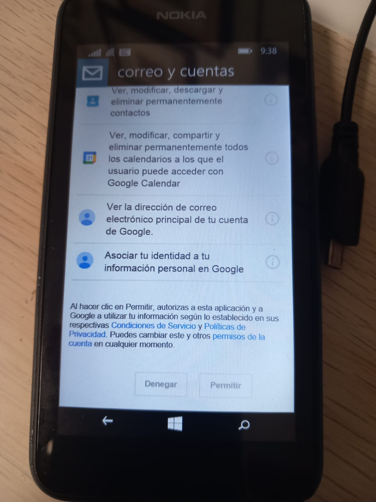 Incluso, superando el error de la fecha y hora curiosamente para la cuenta de Outlook validándonos con nuestra cuenta de Microsoft con la contraseña correcta aceptando en otro terminal los permisos no podemos continuar ( observar en la imagenen de mas abajo como estan desactivados los botones de Permitir o Denegar).