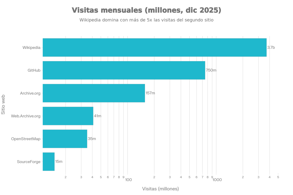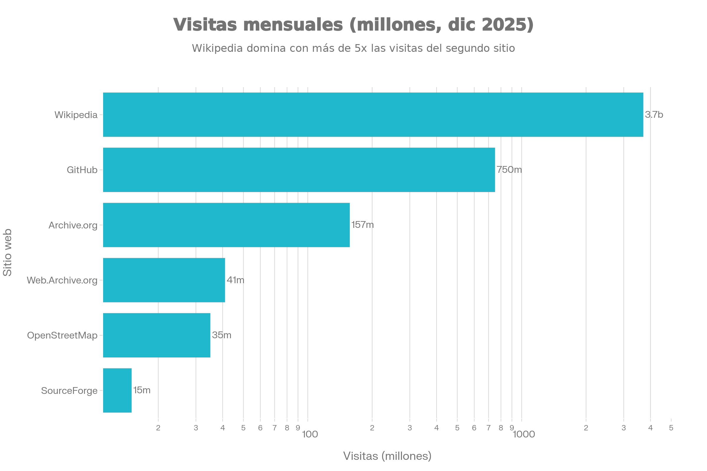 Wikipedia domina por órdenes de magnitud gracias a su rol enciclopédico universal. GitHub destaca en tráfico cualificado de devs, mientras que los demás son más nicho pero esenciales para sus comunidades. Datos de SimilarWeb tienen variaciones (±20% vs. Google Analytics).