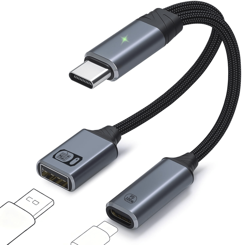 Por ultimo para evitar descargar la bateria necesitamos un Hub OTG con power passthrough para cargar simultáneo, o lo que es lo mismo un cable OTG con dos «bocas», pero ojo porque debemos entender que si es telefono o tableta ciertamente antiguo necesitaremos un adaptador OTG para mini o micro usb, o si es mas moderno un adaptador OTG para conexion USB-C , el cual por cierto no solo servirá para conectar una capturadora de video por hdmi , sino también para conectar otros periféricos como un teclado , un raton, un disco duro , etc
