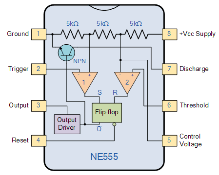 Uno de los elementos clave es una cadena interna de tres resistencias de 5 kΩ, que forma un divisor de tensión y establece dos niveles de referencia internos: aproximadamente 1/3 y 2/3 de la tensión de alimentación. La explicación más extendida sobre el nombre “555” es precisamente esa cadena de tres resistencias de 5 kΩ, aunque Camenzind nunca lo confirmó de forma oficial.