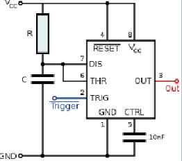 • El comparador de disparo (TRIGGER) conmuta cuando la tensión del condensador baja de 1/3 VCC.