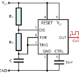 • El condensador se carga y descarga de forma cíclica entre 1/3 VCC y 2/3 VCC mediante dos resistencias externas y el transistor de descarga interno.