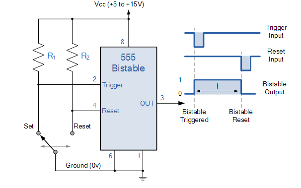 En modo biestable, el 555 actúa como un simple biestable SR sin necesidad de condensador de temporización