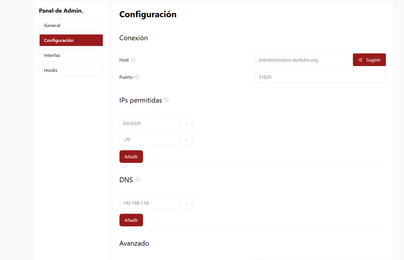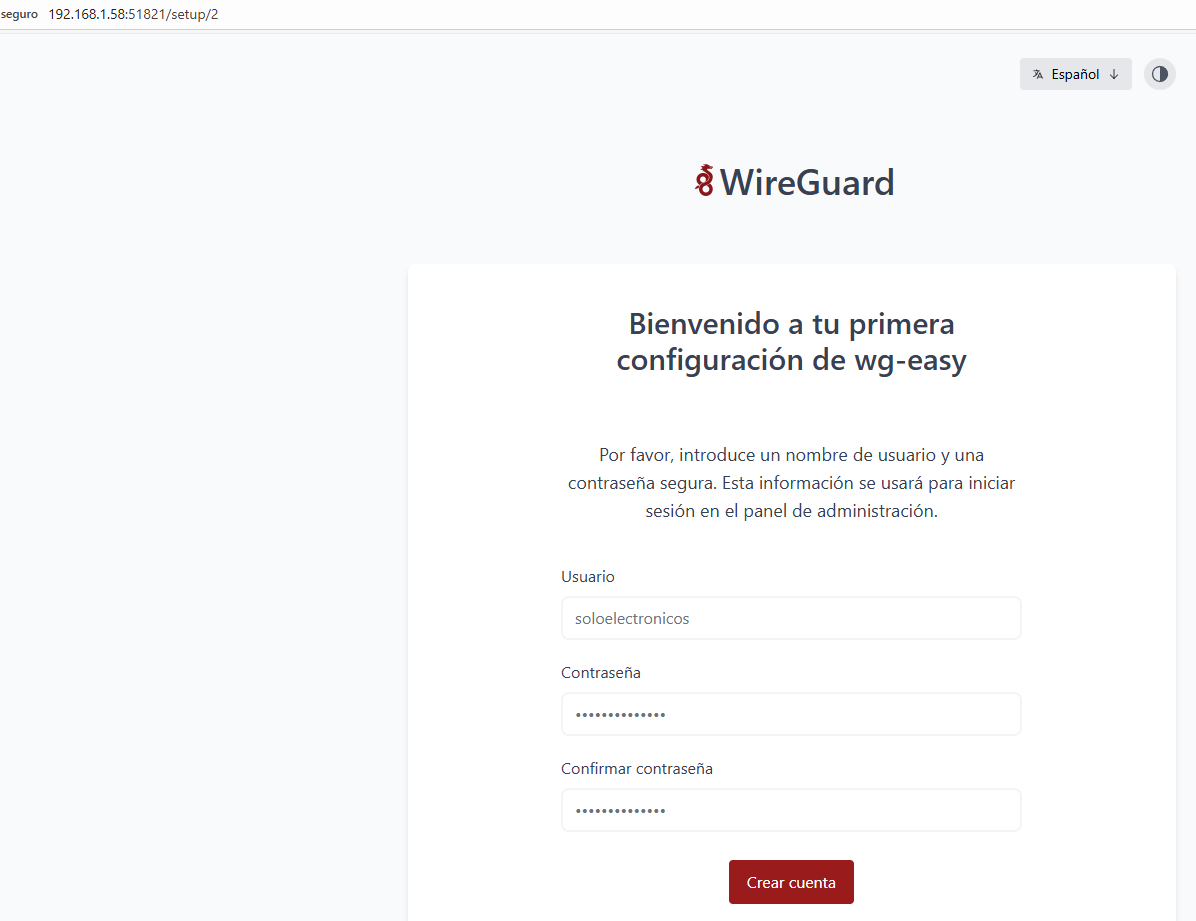 - WireGuard: La VPN. Se configuran los puertos (por defecto 51820 para el servicio y 51821 para el panel web) y la ruta donde se guardarán los archivos.