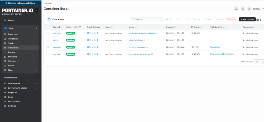 Una vez instalado Docker y Portainer ( vienen ya preinstalados en la ultima versión de raspbian 64bits) , el despliegue se realiza mediante un Stack (Docker Compose). Conceptualmente, el archivo define tres contenedores que se levantan a la vez y se comunican entre sí. WireGuard crea el túnel VPN y expone el puerto 51820/udp. Pi-hole se ejecuta en modo host para poder actuar como servidor DNS real de la red doméstica. DuckDNS corre en segundo plano actualizando tu IP pública asociada al dominio.