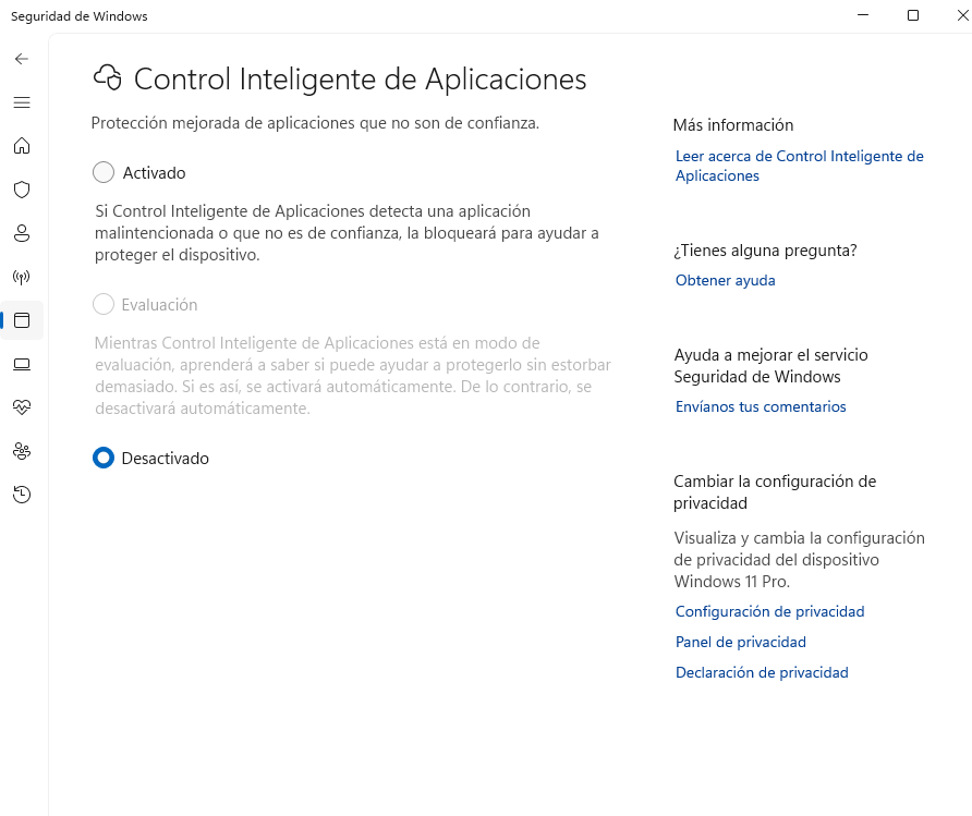 • Usuarios personales: Desactivar Smart App Control es la vía más rápida.